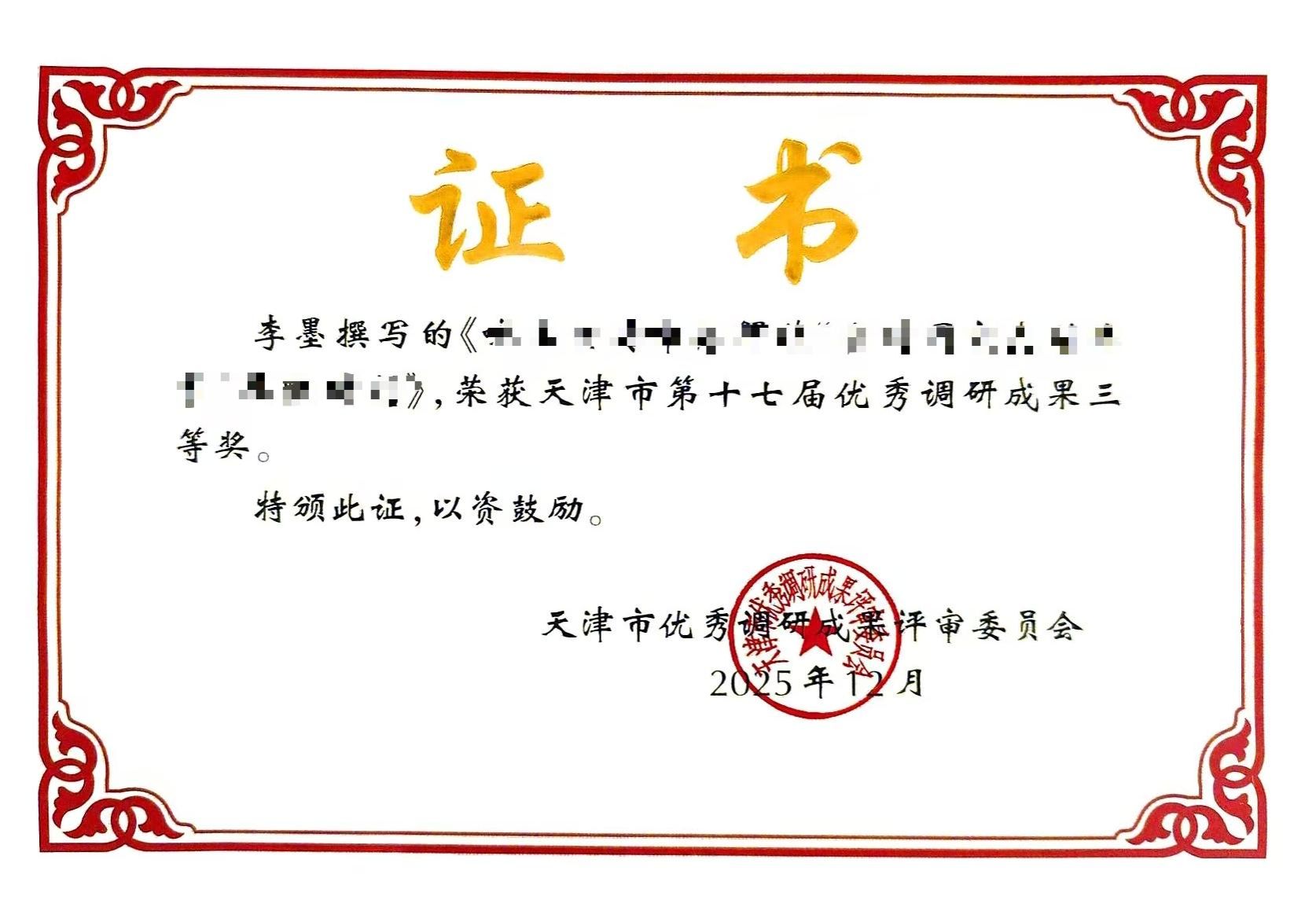 近日,天津市第十七届优秀调研成果奖评审结果正式公布。经天津市优秀调研成果评审委员会严格评选,全市共遴选出优秀调研成果130篇。其中,我校马克思主义学院李墨老师主持完成的调研成果荣获三等奖。